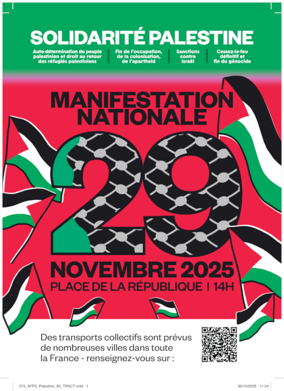 Une cinquantaine de personnes réunies de nouveau ce samedi 08 novembre 2025 à 11h00, place Porte Neuve à l'appel du collectif « Palestine de Valence » réunissant : l'AFPS, EELV, LDH, PC, MRAP. NPA, FSU, Femmes en luth, POI 26, ASTI Valence, LIBRE PENSÉE 26-07, LA CIMADE, Comité de la paix Tain Tournon, CGT, LFI, CNT, PS ainsi que des militants du collectif « Amitié Palestine » de Valence.